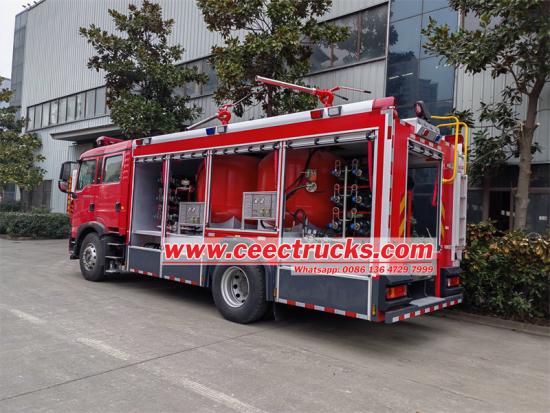 2000L dry powder这是一款基于五十铃FTR底盘打造的干粉氮气消防车,搭载强劲的五十铃4HK1-TC60发动机,排量5.19L,输出功率380马力,采用4X2驱动方式,匹配MLD 6速变速箱,最高车速可达90km/h,可适应各种复杂路况。消防系统方面,该车配备两个2000升碳钢干粉储罐和12个80升氮气瓶,设计压力15MPa。