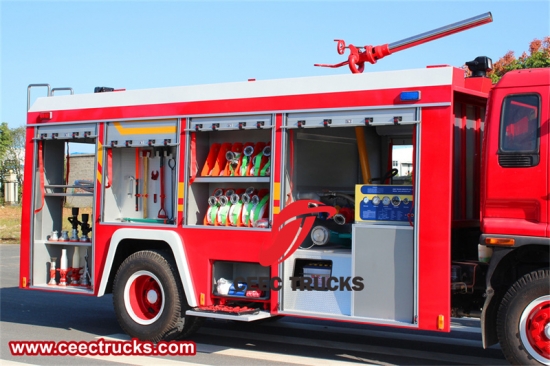 这辆消防车配备一个容量为6立方米的水箱和一个容量为2立方米的泡沫罐。该车辆可携带大量水,这对于扑灭各种规模和强度的火灾至关重要。水箱的设计旨在实现最佳的储水和流量,确保能够通过卡车先进的泵送系统快速高效地排出水。此外,它还配备了泡沫系统。该系统使卡车能够输送水和泡沫的混合物,从而更有效地灭火。泡沫能够覆盖和抑制火焰,降低温度并切断氧气,同时还有助于防止复燃。