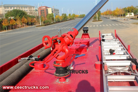 配备前喷、侧喷和洒水装置(洒水宽度>14m) 配消防泵泵(吸程>7米) 配有防火阀、水阀、过滤网。 配备水枪。 油罐车和底盘之间的橡胶垫 配备水泵 配备消防队系统,顶部配备消防枪 |