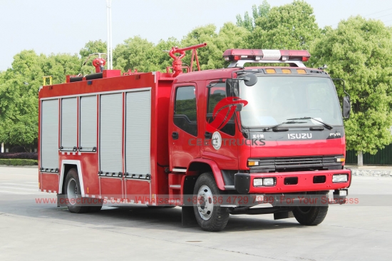 五十铃 FVR 水泡沫干粉消防车,五十铃 FVR 左侧驾驶型号 4x2 底盘,MLD 6 速手动变速箱,五十铃 240HP 柴油发动机,喷漆和标志取决于要求。