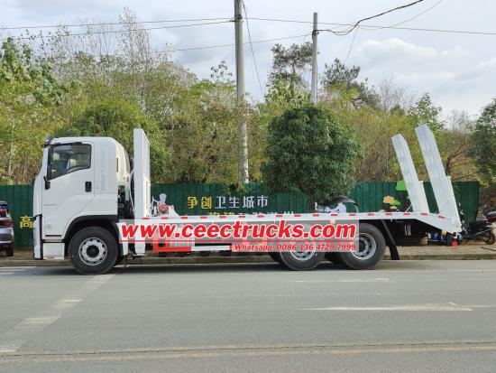 五十铃平板运输车,也称为平板拖车,通常采用凹梁(或井形)型车架。车架前部包含一个鹅颈管,牵引销通过该管与牵引车的牵引销连接。鹅颈管的后端连接到半挂车车架,中间部分构成货物平台——车架的最低部分。后端由轮架组成,轮架包含车轮。将机械设备装载到半挂车上时,通常从后部进行,方法是将设备从后轮架上移开,或者拆下车轮,然后将设备固定在半挂车上。