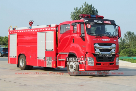 日本品牌五十铃 GIGA 8000 升水箱消防车,五十铃新款 GIGA 左侧驾驶 4x2 底盘,FAST 12 档手动变速箱,五十铃 380HP 柴油发动机,配备中国知名消防泵和消防炮,喷漆和标识取决于要求。