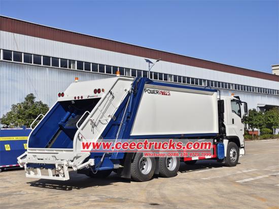Isuzu VC61 6x4 cabin,large capacity garbage bin五十铃 giga 6UZ1 发动机后装载回收车作为一款专为高效城市垃圾处理而设计的重型运输车辆,这款6x4压缩垃圾车采用先进的液压缸驱动压缩系统,高效压缩垃圾,最大限度提升装载能力。它配备多种控制装置,包括驾驶室内的电动操作以及后挡板的手动/电动选项,为操作员提供灵活性和易用性。
