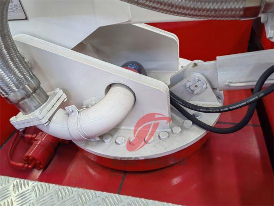 消防系统管路为不锈钢管路+铝合金管路,水管经中心旋转体到达上部车体,可满足供水或泡沫灭火需求。上部臂头处设有电动遥控水枪,可改变水流形态(直喷、溅水),可喷水或泡沫。车体底部设有进水口,满足高层建筑大流量灭火需求。