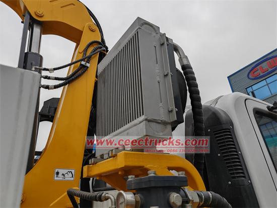 最引人注目的是车辆搭载的徐工LQS78A装载机抓斗起重机,该起重机融合了先进的液压技术和精密的机械结构,最大起重力矩6.8TM,最大起重量700kg,最大起升高度9.8m,起重机长度7.8m,回转角度更是达到了惊人的380°。 ° ,几乎可以实现全方位无死角作业。起重机尾部配备专为抓取原木而设计的双爪抓取器,最大展开抓取尺寸达1220mm,单次抓取原木重量可达1吨,大大提高了林业资源管理效率。