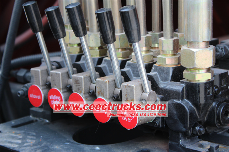 这五十铃垃圾压实车利用专用取力器(PTO)从发动机获取动力,并将动力传递给齿轮泵,使齿轮泵旋转。齿轮泵工作,将液压油通过管路输送至油缸,油缸工作,带动垃圾车所有设备运转,包括尾板、推板、滑板、刮板和倾翻装置。从而实现垃圾车的所有功能。