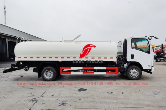 五十铃10,000升不锈钢洒水车,五十铃4x2底盘,MLD六挡手动变速箱,五十铃190马力柴油发动机,名牌不锈钢水泵,304-2B不锈钢油罐车及水管。所有喷漆和标识均根据客户需求定制。