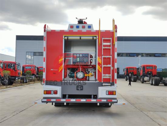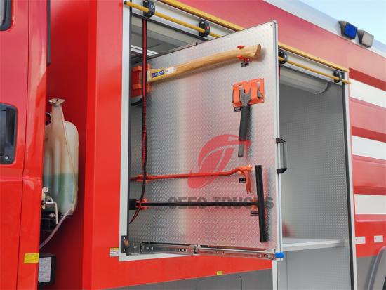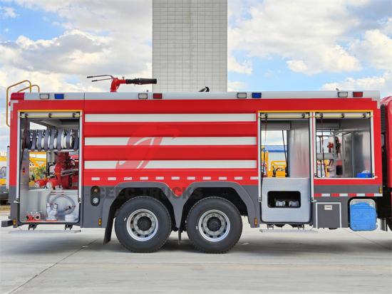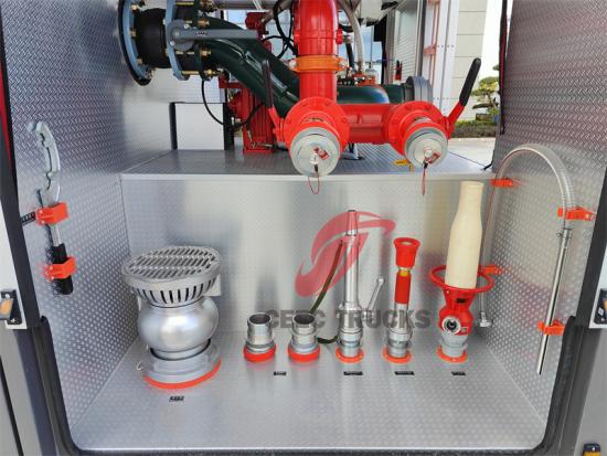 2.水箱供水: 车上配备的10立方米水箱为灭火系统提供充足的水源,消防泵通过管道从水箱中抽水,加压输送至消防炮或泡沫灭火枪。