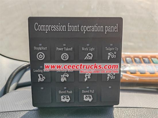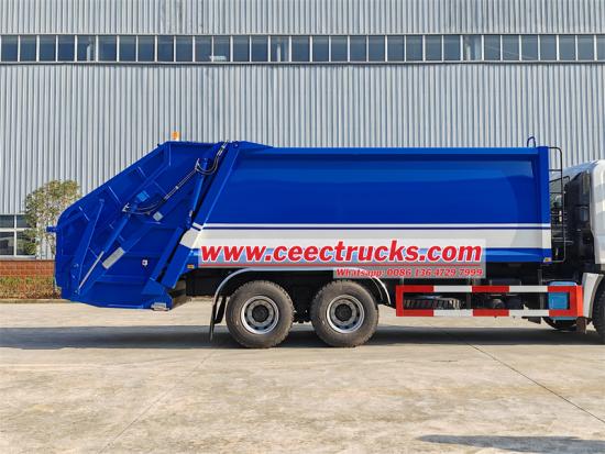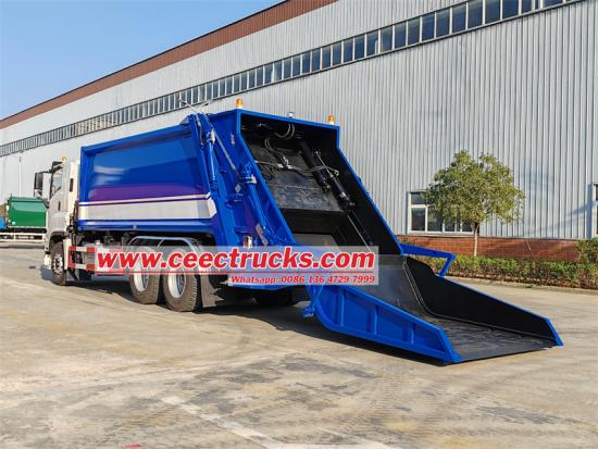CEEC的五十铃GIGA 6×4后装载压实机配备五十铃GIGA 6x4底盘,五十铃380HP柴油发动机,欧6排量15681ml,轴距4800+1370mm/3,气刹,动力转向,中冷器,315/80R22轮胎,2座1卧铺,空调,动力转向,装载量20立方米,垃圾箱尾部有一个落地式大桶,带有全密封垃圾桶翻转机构。