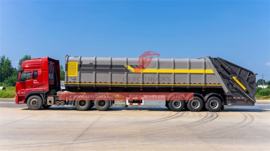 后载45立方米垃圾压缩半挂车 (也称为 垃圾压缩半挂车, 垃圾压缩机半挂车, 后装垃圾拖车, 垃圾压缩机半挂车,后装载机半挂车、垃圾车) 是一种用于收集、压缩和运输固体废物的拖车。垃圾压缩半挂车是废物管理系统中的重要工具,能够高效地收集、压缩和运输固体废物。大容量45立方米垃圾压缩半挂车可以减少废物量并优化运输,有助于创造更清洁、更可持续的环境。